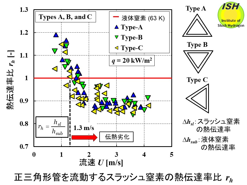 水平正三角形管(一辺 20 mm、水力直径 (D) 11.55 mm)では、 頂点が上向き(Type A)、下向き(逆正三角形、Type B)、横向き(Type C)の3種類の断面姿勢でスラッシュ窒素の実験を行った(加熱時熱流束