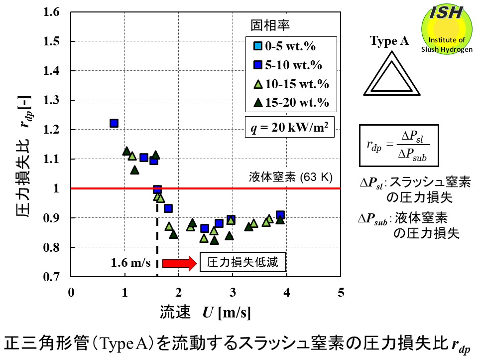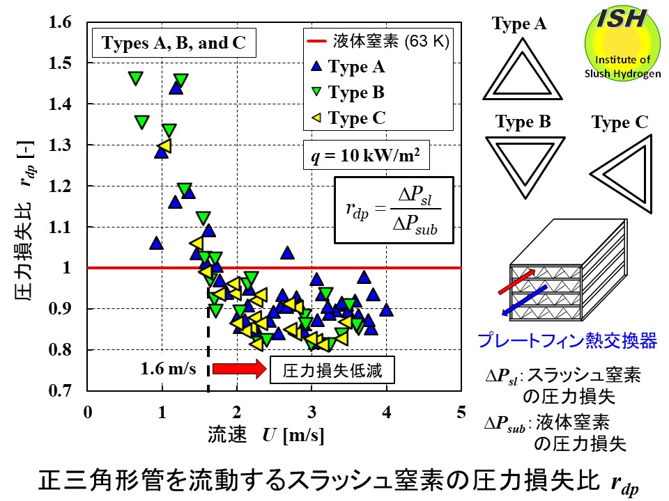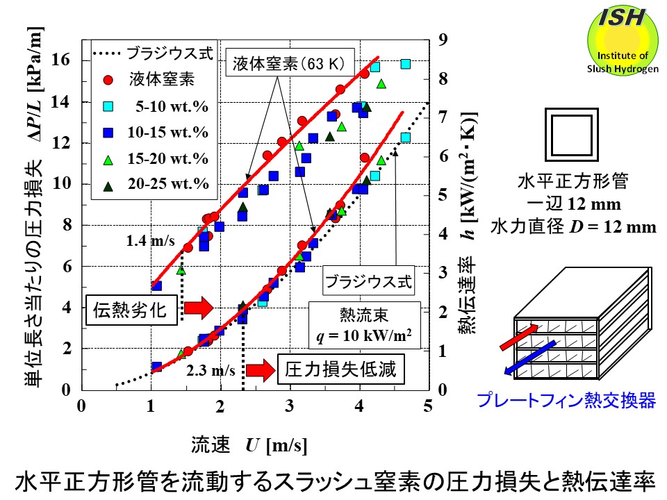 また、一辺 12 mm の水平正方形管では非加熱時に流速 2.5 m/s 以上で圧力損失が液体窒素と比べて最大 12% 低減し、熱流束 10 kW/m2 でも圧力損失が流速 2.3 m/s 以上で最大 12% 低減し、熱伝達率も流速 1.4 m/s 以上で最大 16% 劣化する [23, 24]。