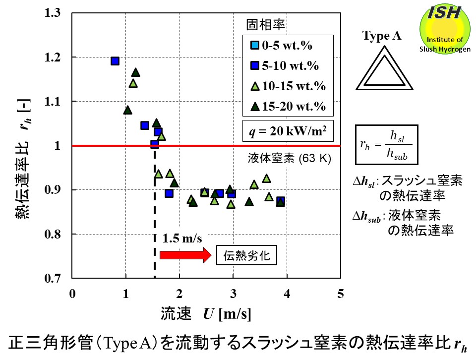 m/s 以上の流速で現れ、最大劣化量は 13-16% であった [22, 24]。同じ流動条件では、圧力損失(流体摩擦係数)が減少すると熱伝達(熱伝達係数)も同時に減少する「レイノルズのアナロジー」(Reynolds' analogy)が固液二相流体であるスラッシュ流体でも成立することを我々は初めて実証した*。