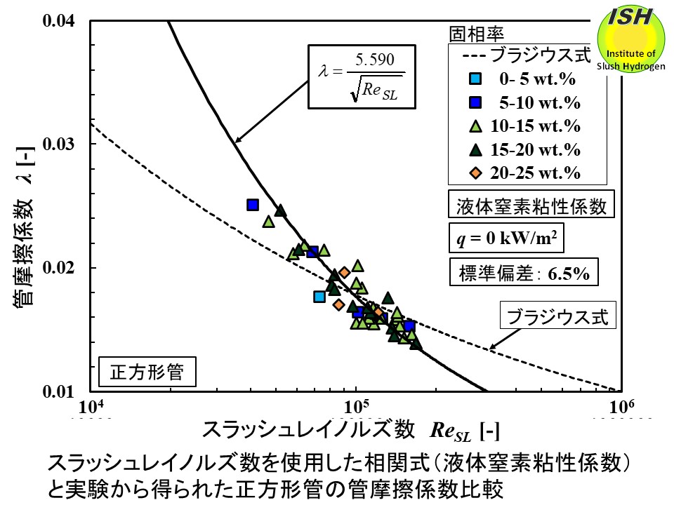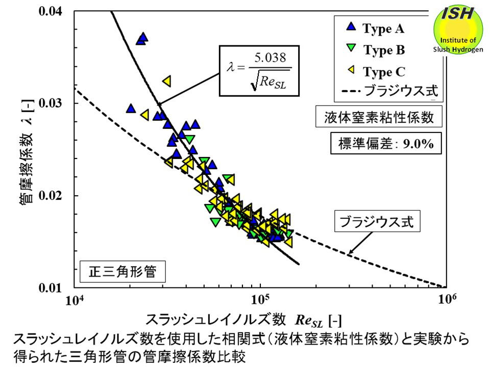 正三角形管の非加熱時の圧力損失データをもとに、液体窒素の粘性係数 μL を用いたスラッシュRe数(ReSL)と管摩擦係数 λ の関係式を最小自乗法により求めると、下図に示すように、流速と体積固相率 x から圧力損失低減を考慮した管摩擦係数を精度良く予測できる関係式が得られる [24]。三角形管の場合、圧力損失低減量が円管と比較して小さいのでみかけの粘性係数