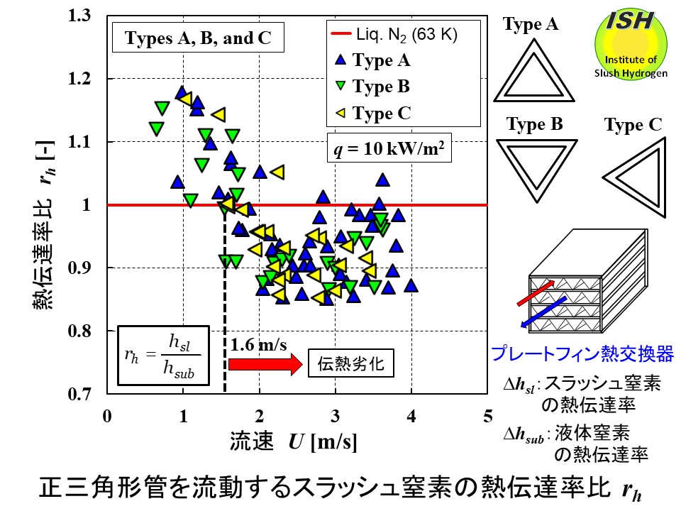 高温超伝導送電用冷媒配管以外に熱交換器等でもスラッシュ窒素の使用が予想され、スラッシュ流体が種々の断面形状をもつ配管内を流動する際の流動、伝熱特性が重要となる。極低温機器に多用されているプレートフィン型コンパクト熱交換器の流路は三角形、矩形管等であり、一般に三角形管は同一水力直径